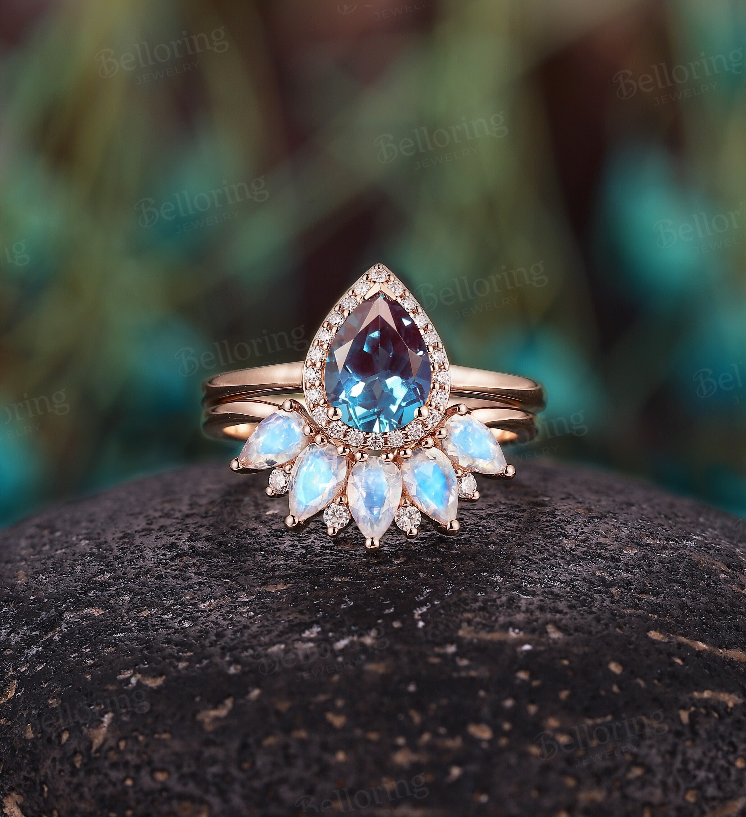 Vintage Alexandrite Engagement Ring Set Art Deco Rose Gold Ring Set Pear Cut Diamond Wedding Ring